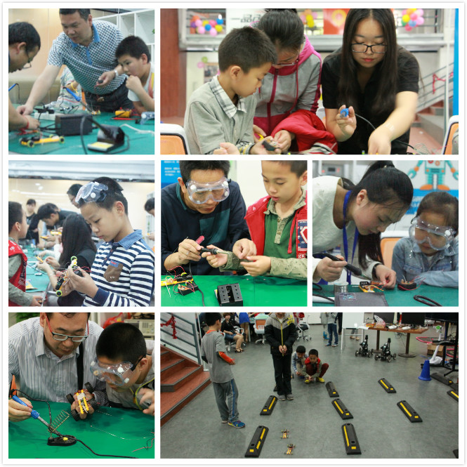 通過簡單的介紹,讓參與活動的家長和小朋友對機器人有初步的了解。隨后,老師帶領大家觀看了展示的機器人,讓大家近距離接觸機器人。當然,光是看是不夠的。接下來的環節就——家長和小朋友一起動手組裝機器人戰車。