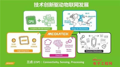在IoT峰會上,聯發科技物聯網事業部副總經理楊裕全先生提到了三點一面的物聯網發展策略。聯發科技將從Connectivity,Sensing,Processing這三點 和Ecosystem這一面出發,全面建立物聯網解決方案的競爭優勢。