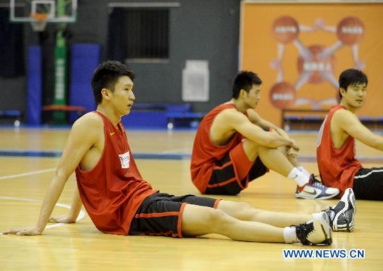 Sun Yue of China's national men's basketball team relaxes on the floor during a training session for the coming Guangzhou Asian Games in Beijing, capital of China, Nov. 9, 2010. (Xinhua/Luo Xiaoguang)