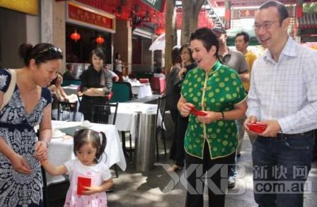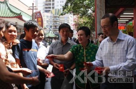 中新網1月31日電 據澳大利亞新快網報道,悉尼市長摩雅(Clover Moore)與悉尼市市議員郭耀文當地時間1月29日(星期六)上午到唐人街拜年。他們沿途向唐人街商家和路人發紅包,恭賀新年。