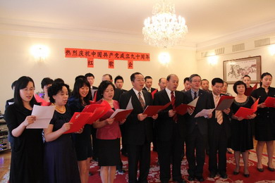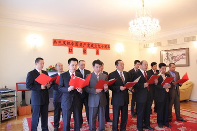 謝總領事在致辭中表示,今年是中國共產黨建黨九十周年,中國駐圣彼得堡總領館黨委今天在“紅五月”開始的第一天舉辦紅歌會,慶賀建黨九十周年,以此拉開駐圣彼得堡總領館慶祝建黨九十周年系列活動的序幕。謝總表示,紅歌是中國革命、建設和改革開放各個時期產生和流傳的紅色經典歌曲,是社會主義中國的時代主旋律。紅歌錄制美好的記憶,每當唱起這些曲調優美、語言精煉、內容向上的紅歌,就仿佛把我們帶到那烽火連天的戰爭時代,帶到那熱火朝天的建設工地,帶到那欣欣向榮、改革開放的城市和鄉村!紅歌引領正確的方向,每當唱起紅歌,我們就更加堅定共產主義理想和建設有中國特色社會主義的信念,使命感和責任感更強,艱苦奮斗、自強不息的自覺性更高!紅歌提振向上的士氣,每當唱起紅歌,我們就感到熱血沸騰、激情澎湃,為理想、為事業更加無所畏懼,精神狀態和革命斗志更加昂揚!紅歌凝聚人心,每當唱起紅歌,我們就更加團結奮進、萬眾一心,凝聚力和戰斗力更強!謝總指出,今年既是中國共產黨建黨九十周年,同時也是我國第十二個五年計劃的開局之年,以加快經濟發展方式、大力調整經濟結構和進一步改善民生為重點的各項改革和發展任務十分繁重和艱巨。與此同時,以服務國家主權、安全和發展利益為主要內容的新時期外交工作同樣任重道遠。新時期、新任務和新要求呼喚科學發展,創新發展,與時俱進,同時也呼喚繼承和發揚優良傳統、優良作風和優良精神。我們舉辦紅歌會,一方面是通過這些紅歌歌頌黨、歌頌祖國、歌頌人民和歌頌美好生活,慶祝和紀念中國共產黨建黨九十周年,另一方面,我們希望通過詠唱這些紅歌,重溫歌曲中洋溢的愛國主義、集體主義、革命英雄主義和樂觀主義精神,用紅歌中體現的優良傳統、優良作風和優良精神鼓舞和鞭策我們在新時期外交工作中創先爭優!