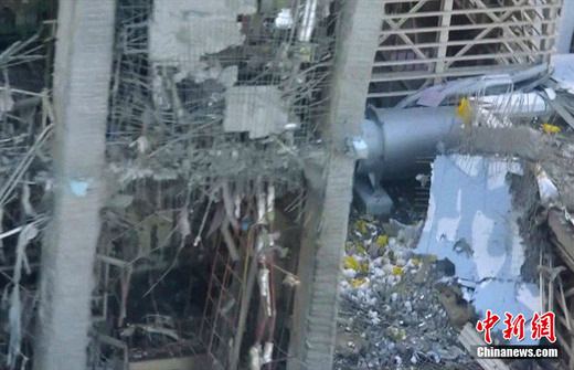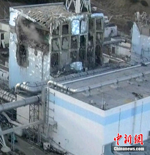 3月16日,由日本自衛(wèi)隊員在直升機(jī)上拍攝的福島第一核電站第四反應(yīng)堆受損近照。