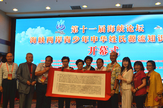 6月14日晚,第十一屆海峽論壇·海峽兩岸青少年中華姓氏源流知識競賽開幕式在廈門華僑大廈(大酒店)舉行。來自海峽兩岸的參賽選手、觀摩師生以及兩岸民間社團嘉賓參加了開幕式暨歡迎晚宴,相關單位領導蒞臨現場。廈門市姓氏源流研究會會長陳淑娥、臺灣姓氏研究學會榮譽理事長林培圣、金門宗族文化研究協會理事長葉鈞培、臺灣中華國際觀光協會理事長詹秀蓉分別致辭,廈門市政協副主席陳昌生對大賽的成功舉辦給予美好祝愿。開幕式上,《廈門與臺灣姓氏文化》一書首發儀式舉行,海峽兩岸民間社團互贈紀念品。