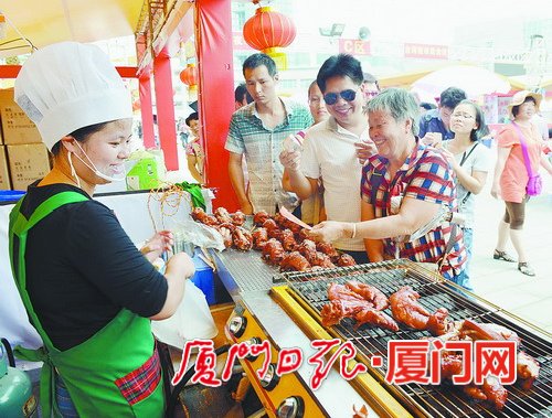 昨天上午10時許,海滄市民文化廣場上,來自兩岸的特色美食香味四溢,紅、黃兩色帳篷下,到處人頭攢動,熱鬧非凡。眾多市民游客聞訊而來,競相品嘗來自臺灣的地道美食。據介紹,本屆廟會共設攤位210個,其中170家來自臺灣,覆蓋臺灣21個縣市,規模之大超越往屆。
