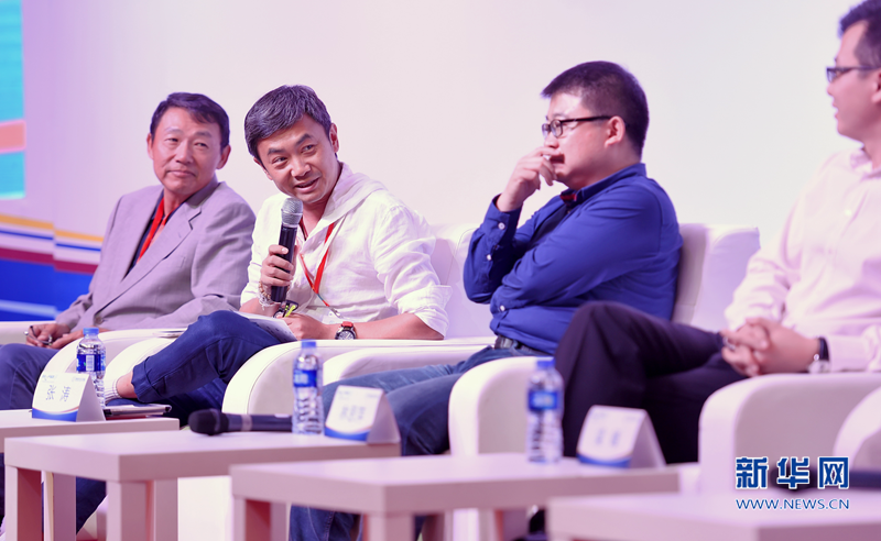 6月12日,“優客工場”創始人毛大慶(左二)在高峰對話環節中發言。新華社記者林善傳攝