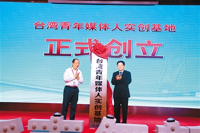 國務(wù)院臺辦新聞局局長馬曉光(右)、國家網(wǎng)信辦網(wǎng)絡(luò)信息傳播局副局長趙波為“臺灣青年媒體人實創(chuàng)基地”揭牌。 圖片來源:《臺聲》雜志