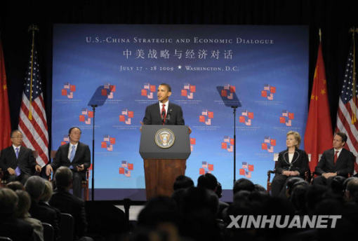 7月27日,首輪中美戰略與經濟對話在美國華盛頓開幕。中國國家主席胡錦濤特別代表、國務院副總理王岐山,國務委員戴秉國出席開幕式。這是美國總統奧巴馬在致辭。新華社記者張巖攝