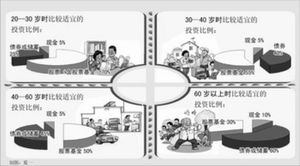 摩根士丹利華鑫基金公司副總經理秦紅表示,一般隨著年齡增長,投資者的風險承受能力會逐步降低,因此需調整激進型理財工具(如:股票基金)和穩健型理財工具(如:債券基金、超短債基金、貨幣市場基金)的投資比例。