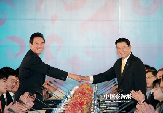 12月21日上午9時,兩岸兩會領導人第六次會談在臺北圓山飯店舉行,海協會會長陳云林與海基會董事長江丙坤在臺北再度握手。(中國臺灣網 鐘寶華 攝)