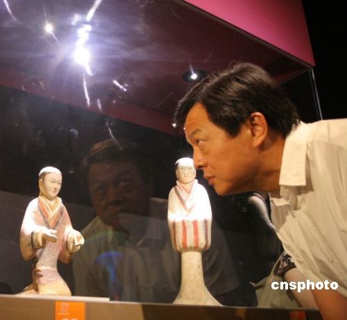 6月27日,“微笑彩俑—漢景帝的地下王國(guó)”特展在臺(tái)北歷史博物館正式開(kāi)展,首日即出現(xiàn)人潮。圖為一向?qū)Φ袼芩囆g(shù)有興趣的臺(tái)北縣長(zhǎng)周錫瑋,在專注觀賞塑衣式彩繪跽坐拱手女俑。中新社發(fā) 董會(huì)峰 攝