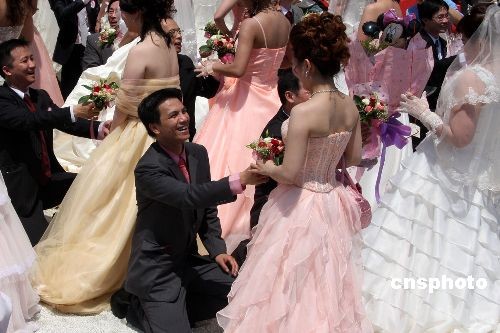 6月28日,50對新人頂著烈日,參加在臺北縣板橋市435藝文中心舉行的露天集體婚禮,現(xiàn)場安排乘坐越野車入場、求婚、擁吻等環(huán)節(jié),場面溫馨而又火爆。圖為眾新郎右膝著地,向新娘獻花、求婚。中新社發(fā) 董會峰 攝