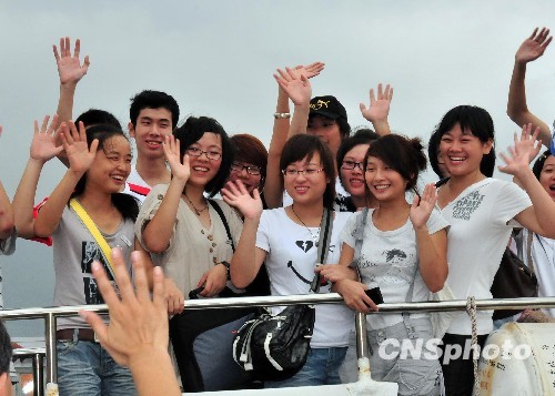 9月16日,起程赴臺就讀一年的福建23名在校大學生在福州馬尾登船后,向前來送行的家人和師生揮手告別。這是福州大學、福建師范大學等福建高校近200名赴臺學生中首批前往臺灣的學生,也是大陸率先成批次選派學生赴臺灣高校學習。中新社發(fā) 張麗君 攝
