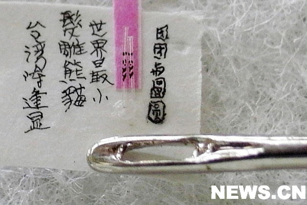 “團團與圓圓”發雕作品以及兩根在直徑約0.04mm的頭發絲上刻畫的大熊貓與普通縫衣針放置在一起(10月16日攝)。
