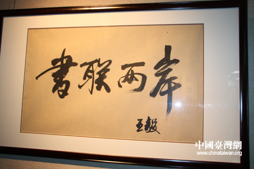 2011年10月11日,上海“海峽杯”首屆書法大賽開幕式在上海圖書館舉辦。兩岸各界200人士出席開幕式,336幅作品展出。圖為國臺辦主任王毅的書法作品“書聯兩岸”。 (中國臺灣網 李桂英 攝)