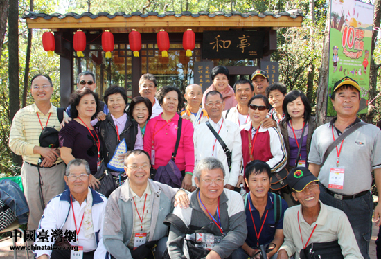 黃石寨內(nèi),臺(tái)灣嘉賓于江丙坤所題匾的和亭前留影。(中國(guó)臺(tái)灣網(wǎng) 王思羽 攝)