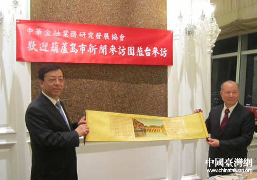 白雪峰與臺(tái)灣中華金融業(yè)務(wù)研究發(fā)展協(xié)會(huì)理事長王榮周互換禮品。(圖片來源:葫蘆島市臺(tái)辦)