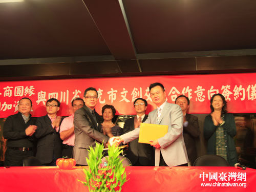 南充市文化創(chuàng)意訪問團(tuán)與臺(tái)灣“圓加資產(chǎn)有限公司”公司簽約儀式。圖片來源:南充市臺(tái)辦