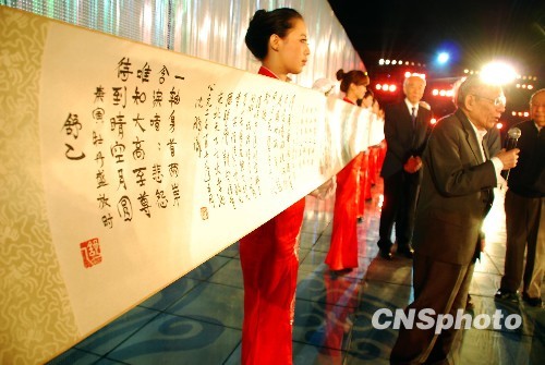 5月15日晚,珍藏在海峽兩岸博物館的《富春山居圖》在北京太廟通過屏幕實現“合璧”。中央文史研究館館長袁行霈為活動致辭,并與館員歐陽中石、程毅中、沈鵬、傅熹年、侯德昌、舒乙一起為高仿真的《富春山居圖》題跋。 中新社發 楊慧峰 攝