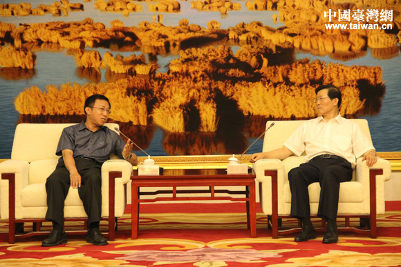 寧夏自治區黨委宣傳部部長蔡國英(右)會見了以國臺辦新聞局局長楊毅為團長的兩岸記者采訪團一行。(中國臺灣網 王文英 攝)