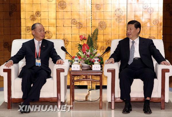 4月10日,國(guó)家副主席習(xí)近平在海南省博鰲會(huì)見(jiàn)出席博鰲亞洲論壇2010年年會(huì)的臺(tái)灣兩岸共同市場(chǎng)基金會(huì)最高顧問(wèn)錢(qián)復(fù)。 新華社記者樊如鈞攝