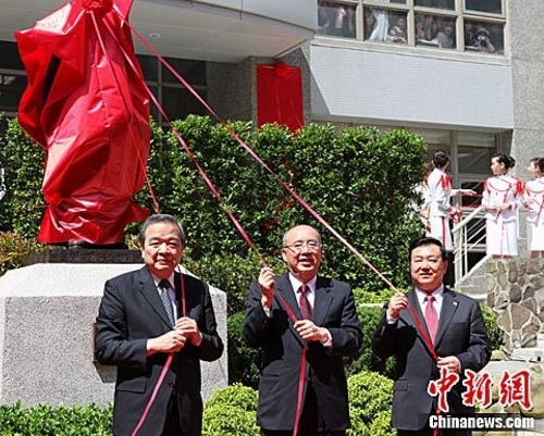 安徽省長王三運(yùn)20日率安徽省經(jīng)貿(mào)文化參訪團(tuán)來到臺灣銘傳大學(xué)桃園校區(qū),向該校贈(zèng)送一尊劉銘傳銅像。圖為王三運(yùn)(右)與中國國民黨榮譽(yù)主席吳伯雄(中)、銘傳大學(xué)校長李銓(左)共同為銅像揭幕。中新社發(fā) 路梅 攝