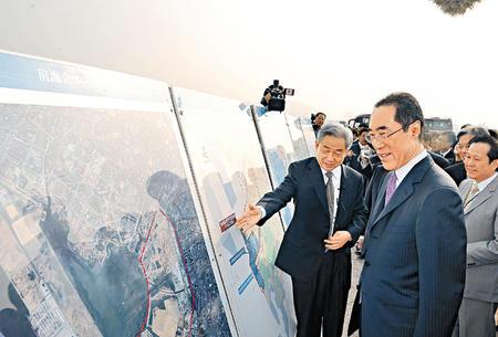 率領(lǐng)三十多名商界精英到前海考察的唐英年,聽取前海現(xiàn)代服務(wù)業(yè)合作區(qū)介紹