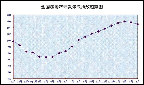 5月份,全國房地產開發景氣指數(簡稱“國房景氣指數”)為105.07,比4月份回落0.59點,比去年同期提高9.13點。