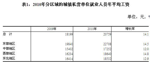統(tǒng)計(jì)局日前公布了2010年城鎮(zhèn)私營(yíng)單位就業(yè)人員年平均工資統(tǒng)計(jì)數(shù)據(jù)。數(shù)據(jù)顯示,2010年全國(guó)城鎮(zhèn)私營(yíng)單位就業(yè)人員年平均工資為20759元,與2009年的18199元相比,增加了2560元,同比增長(zhǎng)14.1%,增幅提高7.5個(gè)百分點(diǎn)。私營(yíng)單位就業(yè)人員年平均工資低于城鎮(zhèn)非私營(yíng)單位在崗職工平均工資,但增長(zhǎng)速度高于非私營(yíng)單位0.6個(gè)百分點(diǎn)。