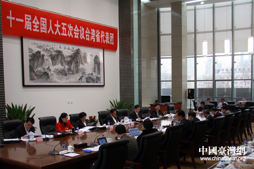 人大臺灣團13位代表5日下午在代表團駐地討論本年度政府工作報告。(中國臺灣網(wǎng) 王偉 攝)