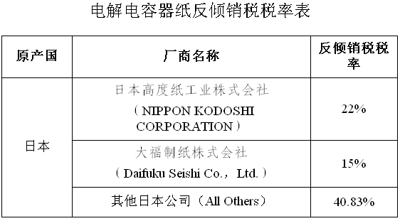 根據《中華人民共和國反傾銷條例》的規定,國務院關稅稅則委員會決定自2007年4月18日起,對原產于日本的進口電解電容器紙征收反傾銷稅,期限為5年。商務部為此發布了中華人民共和國商務部2007年第30號公告(詳見附件1)。現將執行中的有關問題公告如下:
