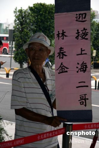 兩岸周末包機七月四日啟程,臺灣社會各界關(guān)注。二十歲來到臺灣的老伯林振鳳一大早從臺南趕到臺北松山機場,接搭乘兩岸周末包機八十四歲的二哥林春金。這將是林振鳳老人自十六年前臺灣當(dāng)局開放到大陸探親后,他再次與兄弟相見。 中新社發(fā) 徐長安 攝