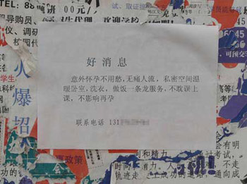 “三分鐘無痛人流”、“更人性化的人流”、“愛她,就為她選擇無痛人流”……“人流”廣告宣傳單,日漸入侵校園。
