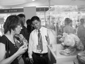 “藝博會(huì)”開(kāi)幕當(dāng)天,臺(tái)灣苗栗縣三義木雕協(xié)會(huì)的張家琪就與一位上海的客商做成了一筆生意。他特地向觀眾介紹一件兩岸合作的參展作品《一鼓作氣》,他說(shuō),作品是臺(tái)灣最著名的蟾蜍雕刻師施振木用大陸的老鼓作底座,在上面雕刻一只金蟾蜍,寓意“兩岸和平才是最大的財(cái)氣!”(許海生 攝)