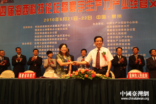 中國臺灣網6月21日泉州消息 第四屆海西科技論壇暨寰宇生產力產業經管交流論壇今日上午在泉州開幕,開幕式上,舉行了福建省科技廳與泉州市政府廳市合作協議簽訂儀式。