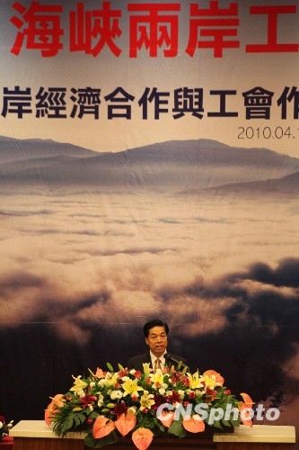 4月10日,以“兩岸經濟合作與工會作用”為主題的第四屆海峽兩岸工會論壇在臺灣高雄舉行,這是該論壇2006年創辦以來首次在臺灣舉辦。圖為率大陸代表團參加論壇的中華全國總工會副主席徐震寰在開幕式上致辭。 中新社發 羅欽文 攝