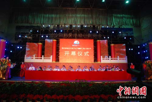 中新網石獅6月17日電(林永傳 郭斌)16日是中國傳統端午佳節,也是閩南所稱的“五月節”。當晚,第四屆閩臺對渡文化節暨蚶江海上潑水節開幕式在福建石獅市體育館舉行。