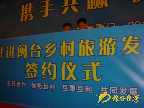 洽談會上,臺灣臺北縣坪林鄉、宜蘭縣礁溪鎮、南投縣國姓鄉、臺東縣成功鎮等10個鄉鎮和福建閩侯縣南嶼鎮、廈門市同安區汀溪鎮、南安市蓬華鎮、平潭蘇澳鎮等10個鄉鎮,利用洽談會平臺,開展了對接洽談并共同簽署了《推進閩臺鄉村旅游發展合作宣言》。
