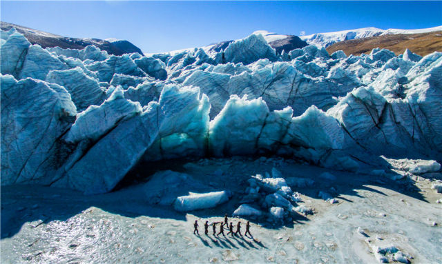 普瑪江塘邊防派出所官兵在崗布冰川下巡邏(1月19日攝)。 新華社記者 普布扎西 攝