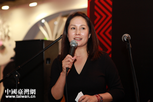 臺灣民意代表高金素梅向觀眾推介“部落行銷”產品。(中國臺灣網 王偉 攝)