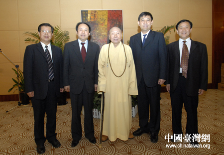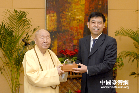 會見時,閆超英首先歡迎惟覺長老和中臺禪寺參訪團蒞陜參訪。他說,這次向臺灣中臺禪寺贈送西安碑林拓片活動是在兩岸關系和平發展、兩岸同胞大交流的新形勢下兩岸文化交流的又一盛事。在這次活動中,陜西省臺辦有幸參與了整個活動的發起、組織、實施,并將繼續積極配合在臺灣展示的全過程。閆超英盛贊中臺禪寺在惟覺長老的帶領、主持下,在兩岸關系和平發展的進程中,致力于推動兩岸宗教文化交流,遵循著兩岸同胞同屬一個中國,同為炎黃子孫,同一祖先、同一血脈的情感和認知。愿以這次贈送碑林拓片活動為新的起點,與中臺禪寺攜手合作,共同弘揚中華優秀文化,共同推動陜臺兩地宗教、文化、經貿、旅游的交流與合作,為兩岸人民謀福祉,為兩岸和平發展盡心力。
