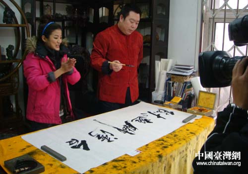 臺灣記者們專訪了遼硯傳人章永軍,了解了遼硯石材的獨特優(yōu)點,以及遼硯的藝術觀賞和珍藏價值遼硯傳人。當代著名書法家、工藝美術大師章永軍還即興揮毫潑墨為節(jié)目組留下“臺灣腳逛大陸”墨寶贈送臺灣中天電視臺。(中國臺灣網(wǎng)本溪市臺辦通訊員 楊宏石)