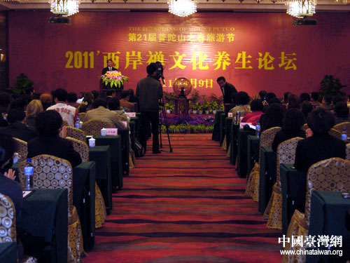 中國(guó)臺(tái)灣網(wǎng)4月12日舟山消息 作為第二十一屆“普陀山之春”旅游節(jié)的重頭戲,由普陀山之春組委會(huì)和舟山市海峽兩岸交流協(xié)會(huì)共同主辦的“2011兩岸禪文化養(yǎng)生論壇”日前在浙江普陀山隆重舉行。來(lái)自臺(tái)灣海濤法師、臺(tái)灣千億生物科技股份有限公司董事長(zhǎng)陳為圣、中華文化復(fù)興研究院院長(zhǎng)李伯淳等兩岸養(yǎng)生專家及有關(guān)人士共300多人參加論壇。舟山市副市長(zhǎng)陳松菊出席論壇。