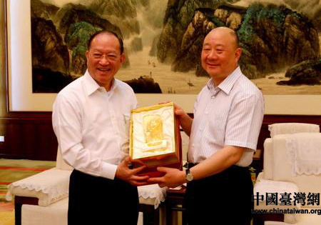 湖北省副省長田承忠(右)會見臺灣肥料股份有限公司董事長鐘榮吉(左),圖為兩人交換禮品。(湖北省臺辦 朱琨 攝)