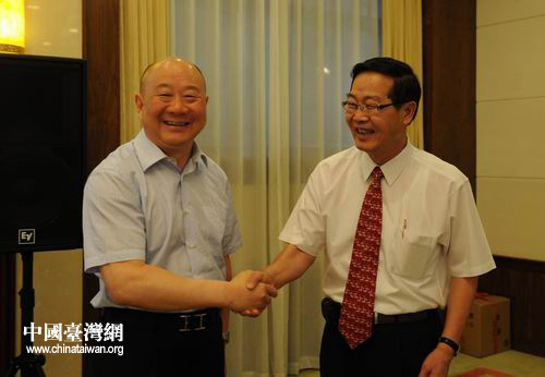 湖北省副省長田承忠與臺灣南投縣縣長李朝卿親切握手。(湖北省臺辦 陸勝 攝)
