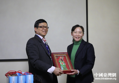 臺中市經(jīng)濟(jì)發(fā)展局局長王誕生(左)與金盞金融服務(wù)園區(qū)管委會副主任孫琦互贈紀(jì)念品。(圖片來源:北京朝陽區(qū)臺辦)
