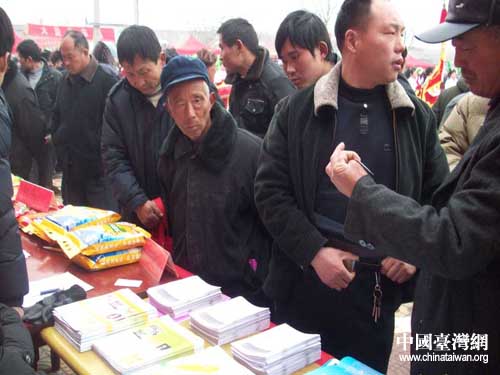 商丘市睢陽區臺辦聯合區科技局組成“科技下鄉服務隊”到火神臺廟會,向臺屬贈送科技書藉。(圖片來源:商丘市睢陽區臺辦)
