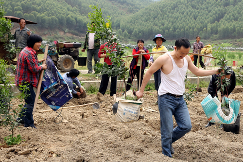 當天,春光明媚,蘇宮村的黨員和村民早已在田間忙碌起來,區臺辦干部職工改變以往的下村到村委會走走,開座談會的方式,直接走到田頭,扛起鋤頭,和村民一起熱火朝天地干起農活來。在地里,村民們正在栽種剛從重慶采購的新品種——沃柑,今年以來,自治區臺辦駐村第一書記李顯德經過多方了解協調,籌集經費,為村里購進這一批樹苗。李顯德介紹說,這些樹苗三年可成熟掛果,能給村民帶來可觀的經濟收益。自治區臺辦全辦干部職工和村民們共同種下1500多株沃柑。