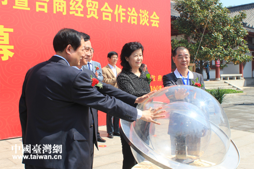 張雪燕與出席開幕式的領(lǐng)導(dǎo)同志和臺(tái)商代表共同按下水晶球。(圖片來源:泰安市臺(tái)辦)