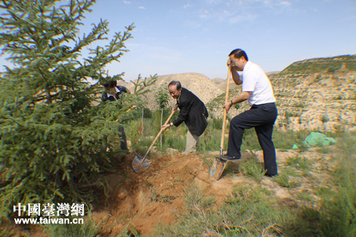 臺(tái)灣新黨主席郁慕明親手栽種隴臺(tái)親情樹。(圖片來源:甘肅省臺(tái)辦)