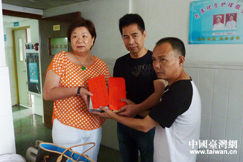 肇慶臺商為患白血病患者馮月霞捐款,鼓勵患者早日戰勝病魔。圖為劉何玉鈴女士(左)、林文濱先生(中)和馮月霞丈夫(右)。(圖片來源:肇慶市臺辦)